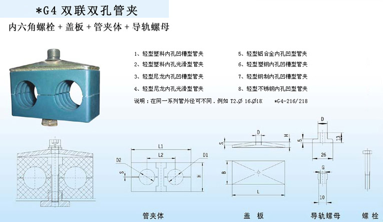 雙聯(lián)系列管夾適用于5種尺寸的普通機械壓力管道,管道外徑6-42mm。該類管夾配件包括蓋板、導(dǎo)軌螺母、管夾體和螺栓,通常和管夾導(dǎo)軌配套使用。